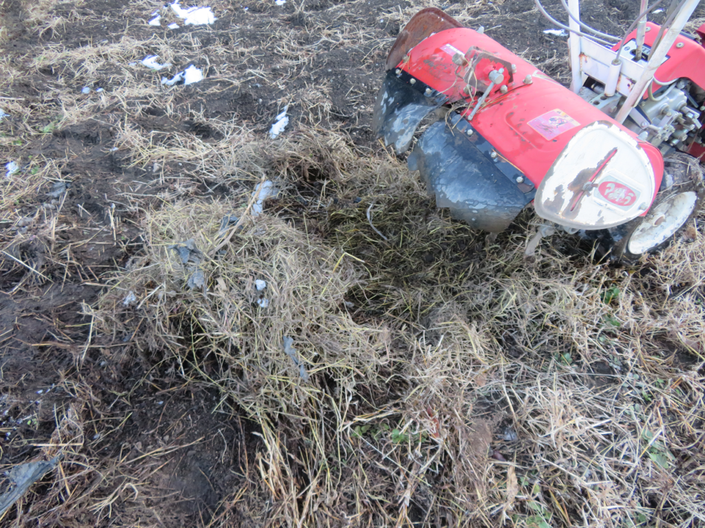 スタートからマメトラがご機嫌斜めだった。前回畑を耕した後、ローター部に絡んだ雑草を撤去しておかなかった事が原因。いざネギの畝の脇を耕そうとしたらローターがピクリとも動かない。なるほど「マメトラくんごめん!」。ローターに絡んだ草が凍ったままだ。急いで撤去したところ枯れた雑草がごっそり。