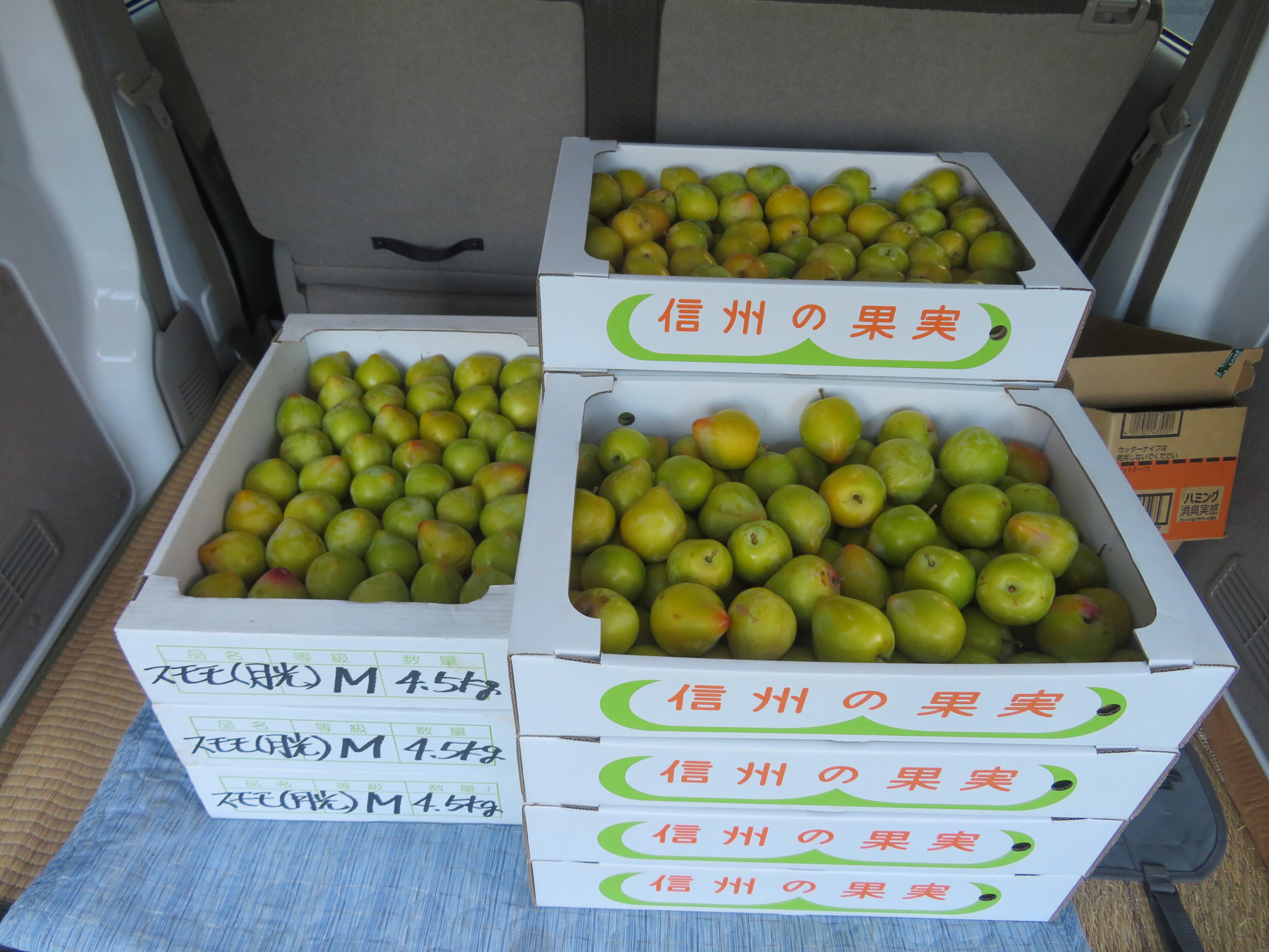日中収穫したスモモ(月光)を、夕刻に松本中央卸売市場に出荷した。 (休日農家の)私は、7月22日朝の競りに間に合わせようと急いだ。 写真左側のMサイズ1箱4.5Kgと右側Sサイズ5Kg1箱5.0Kgとし、Lサイズは ...